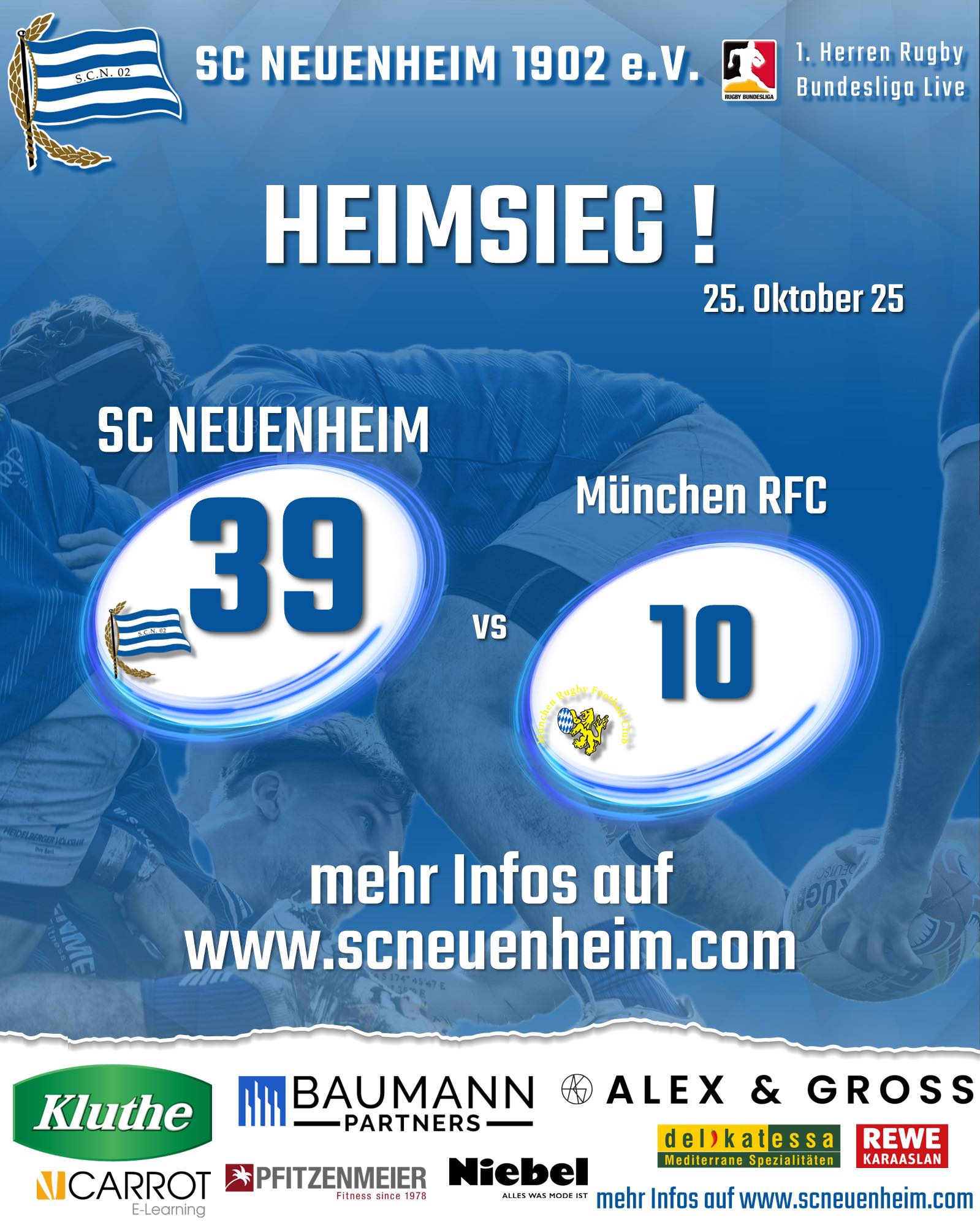 Der Sportclub Neuenheim hat auch sein sechstes Bundesliga-Spiel mit offensivem Bonuspunkt gewonnen und bleibt mit der optimalen Ausbeute von 30 Punkten gleichauf mit dem Titelverteidiger SC Frankfurt 1880 an der Tabellenspitze. Gegen die sehr kampfstarke Mannschaft des München RFC gelang dem Team von Trainer Alexis Michel, der angesichts seines großen und gleichmäßig besetzten Spielerkreises ein wenig rotierte, ein 39:10 (22:3)-Sieg, wobei nur zwei der sieben sehr gut herausgespielten Versuche, für die sieben verschiedene Akteure sorgten, durch Finn Schwager erhöht wurden. Vier Erhöhungen verwehte der böige Wind, eine erfolgreiche Erhöhung fand nicht die Anerkennung der Seitenrichter.Beide Teams zeichneten sich durch hervorragende Verteidigungsarbeit aus, wobei der Münchener Versuch durch Maximilian Engelhardt erst sechs Minuten vor dem Schlusspfiff des guten Schiedsrichters Julian Noster erzielt wurde. Der gebürtige Heidelberger Nationalspieler Niklas Hohl traf für den MRFC mit einem Straftritt zur 0:3-Führung und mit der finalen Erhöhung. Im SCN-Team leisteten die acht Stürmer Schwerstarbeit, während das Angriffsspiel der Dreiviertelreihe diesmal etwas unpräzise war, weshalb weitere mögliche Versuche nicht fielen.