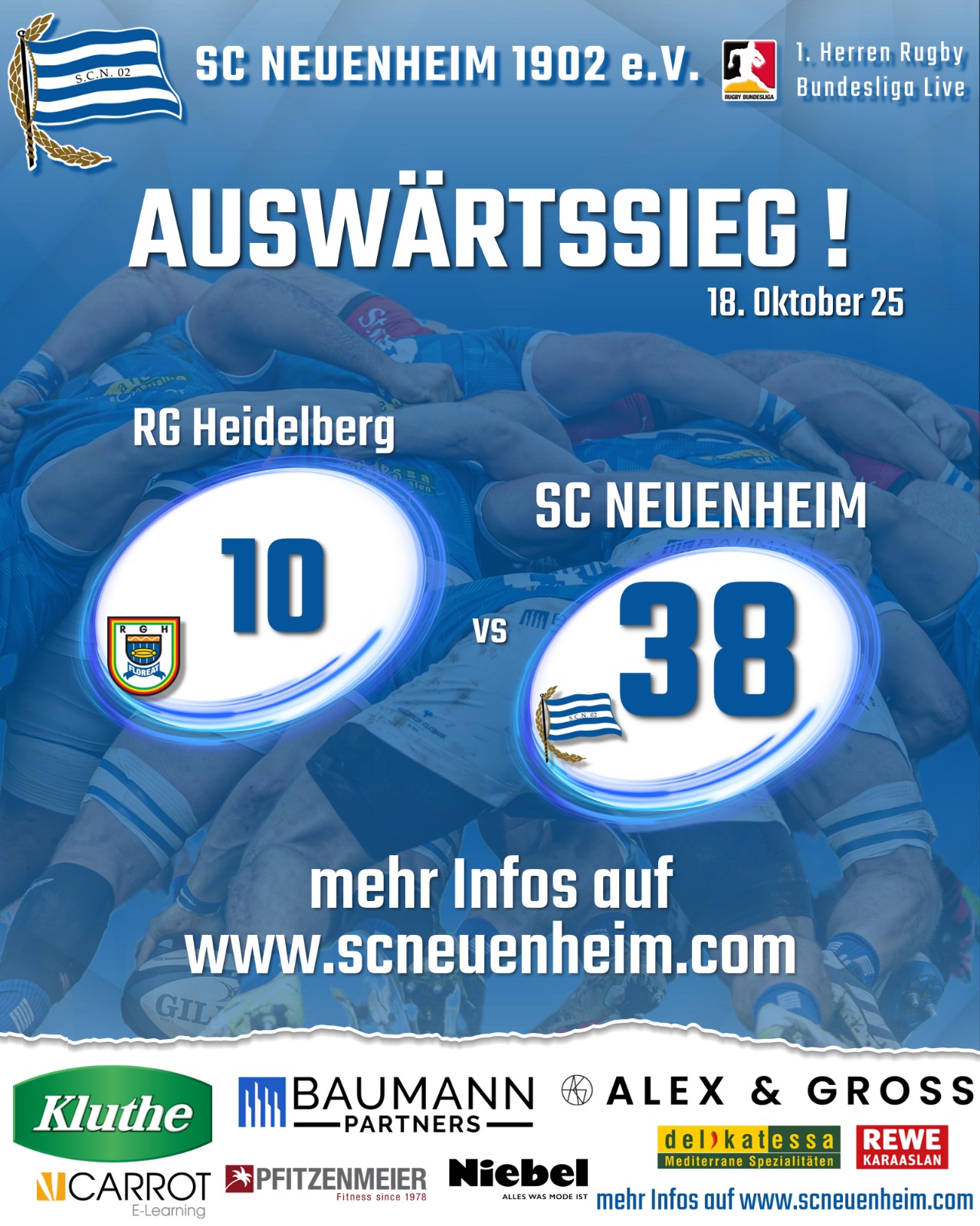 RG Heidelberg – SC Neuenheim 10:38 (3:14); SCN: Lammers (75. Noll) – Arnold, Bülow, Schwager, Becker (70. Strauß) – N Klewinghaus, Lieb – Rinklin, Troch (75. Herzog), Amelung – Portillo (60. T Sengewitz), Lehmann (70. Brockmann) – Bachmann, Heuser (55. Köpper), Weiss (55. Jankarashvili).