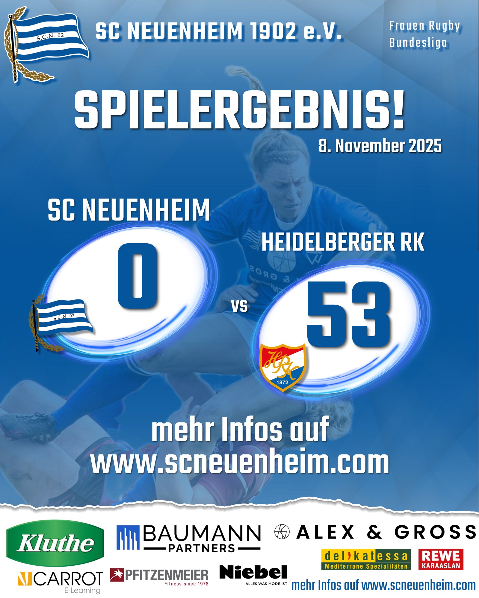SC Neuenheim – Heidelberger RK 0:53 (0:36); SCN: 1 KIMONIMA, Godwina (45. ERHART, Pia) 2 BERGEMANN, Annika (55. GAUGER, Vera) 3 BIER, Mareike 4 WAIBEL, Maike (41. ABBOTT, Alena) 5 HARRIS, Amelie 6 DEHNERT, Emma (41. REINBOLD, Kristina) 7 ENGLMANN, Kerstin 8 ABDELKARIM, Yusra (70. FALCONE, Letitia) 9 GÜNTHER, Catharina 10 TAUSCHEK, Clara 11 PARMETLER Lisa (41. REINBOLD, Kristina) 12 GRUBER, Steffi 13 DREWENSKUS, Maike 14 LEE, Jenna (61. BUCH. Leonie) 15 BRUMMEL, Anna.